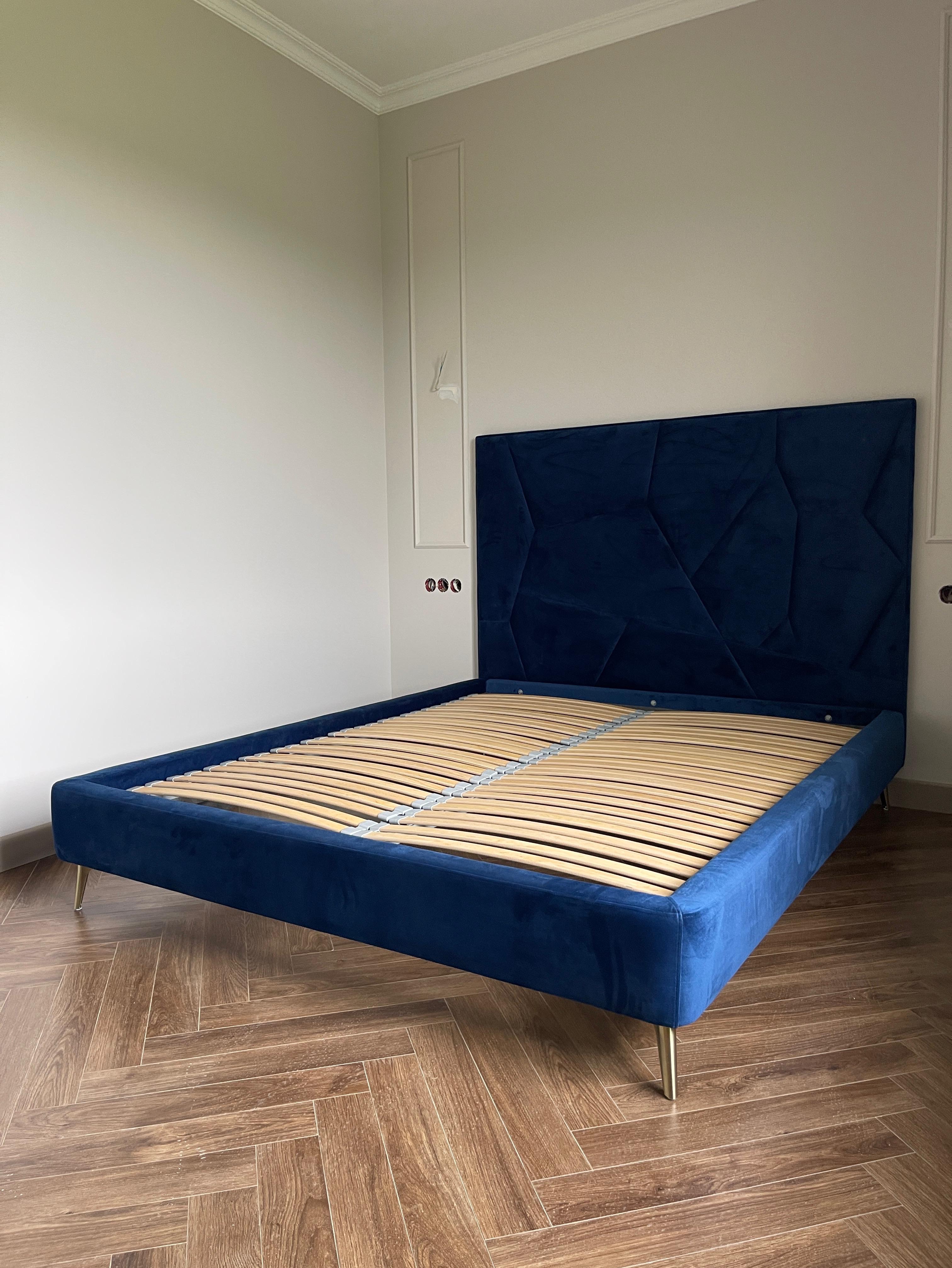Эта двуспальная кровать — это смелое дизайнерское высказывание, где искусство встречается с передовым комфортом. Ее главный акцент — мягкое изголовье, превращенное в абстрактную картину из синей ткани. Собранная в сложную композицию из контрастных геометрических фигур, эта панель создает мощный визуальный ритм и мгновенно приковывает взгляд, задавая всей спальне современный и динамичный характер.
